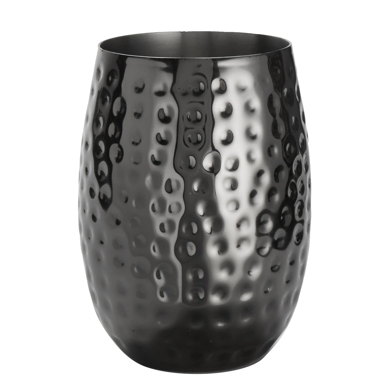 This 14 ounce mule cup from American Metalcraft features a black mirror finish and the hammered design will be sure to make a splash at the bar! This durable cup also features double-wall stainless steel construction and is perfect for use with a variety of beverages.