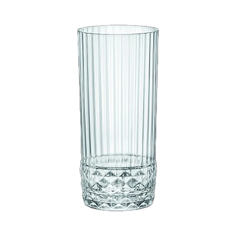 This cooler glass is part of the America ’20s Collection from Bormioli Rocco.These 1920s-inspired glasses bring the glamour of trendy American jazz bars through to today. Where conversation was about art and the ambiance was of unprecedented newness and enthusiasm. All the products are characterised by an elegant and original vintage style, in line with the latest trends, and are embellished with dense facets that develop precious light effects, enhancing the colors of cocktails and drinks.