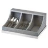 For al all‐purpose solution to your cutlery and condiment display needs, use the Cal Mil 1235‐39‐43 wire and faux glass display. Three large bins rest in a vertically‐designed modern wire frame. Its bold black color is accented by the classic green acrylic glass of the inner bins which serve to offer cutlery, or packets of ketchup, mustard, sugar, artificial sweetener, lemon, jelly, and much more.