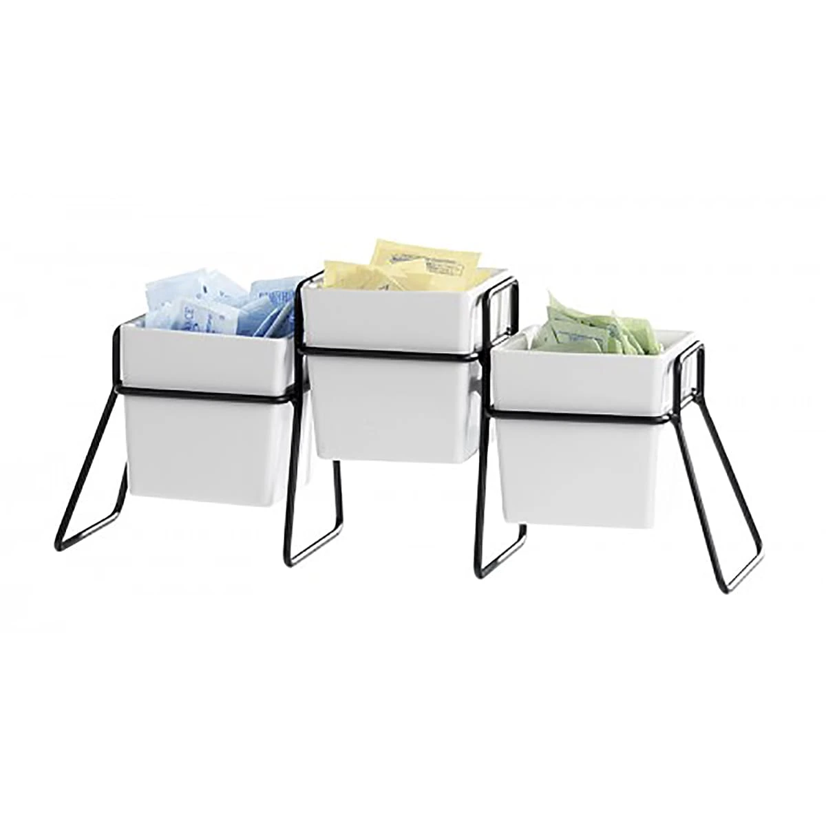 Add a new look to your condiments, with this black wire jar display from Cal‐Mil. The display includes 3 melamine crocks that can hold packets, condiments, and any other number of items. Use in a foood presentation or as a table center.