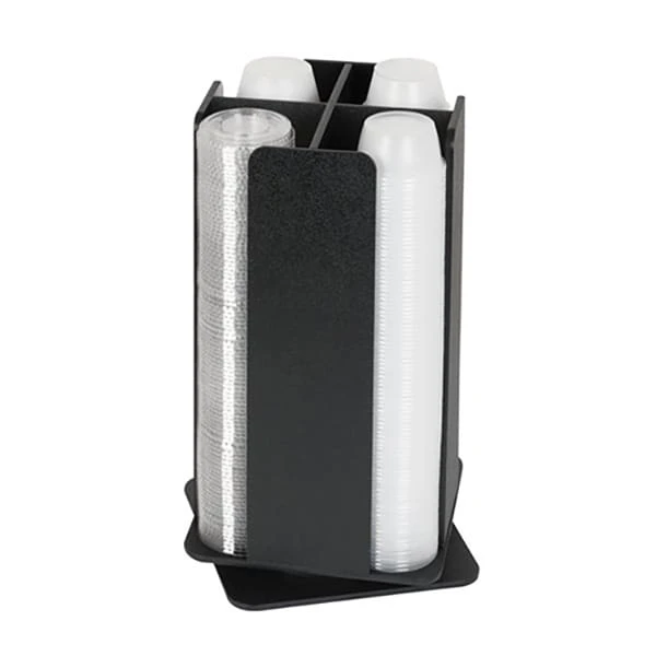 This Dispense‐Rite revolving portion cup & lid organizer features durable polystyrene construction with a built in spinning carousel for easy access to all four cup or lid compartments. The maximum acceptable portion cup or lid diameter is 3″.