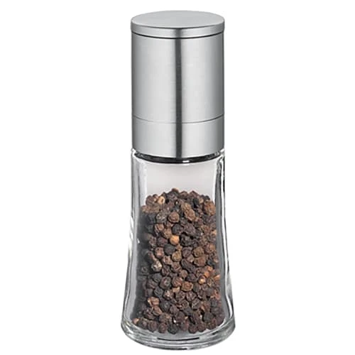 This 5.5″ tall pepper mill is adjustable from super fine to coarse and features a stainless steel and glass design. Keeps spices fresh and work area clean!