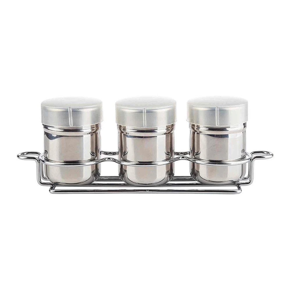 Create the perfect coffee station with this 3‐piece shaker set from TableCraft. Use for dusting your drinks with sweet toppings, then store in the stylish rack. This set with rack includes: (3( Shakers “Cinnamon”, “Cocoa” & “Nutmeg” & (3( Storage Caps.