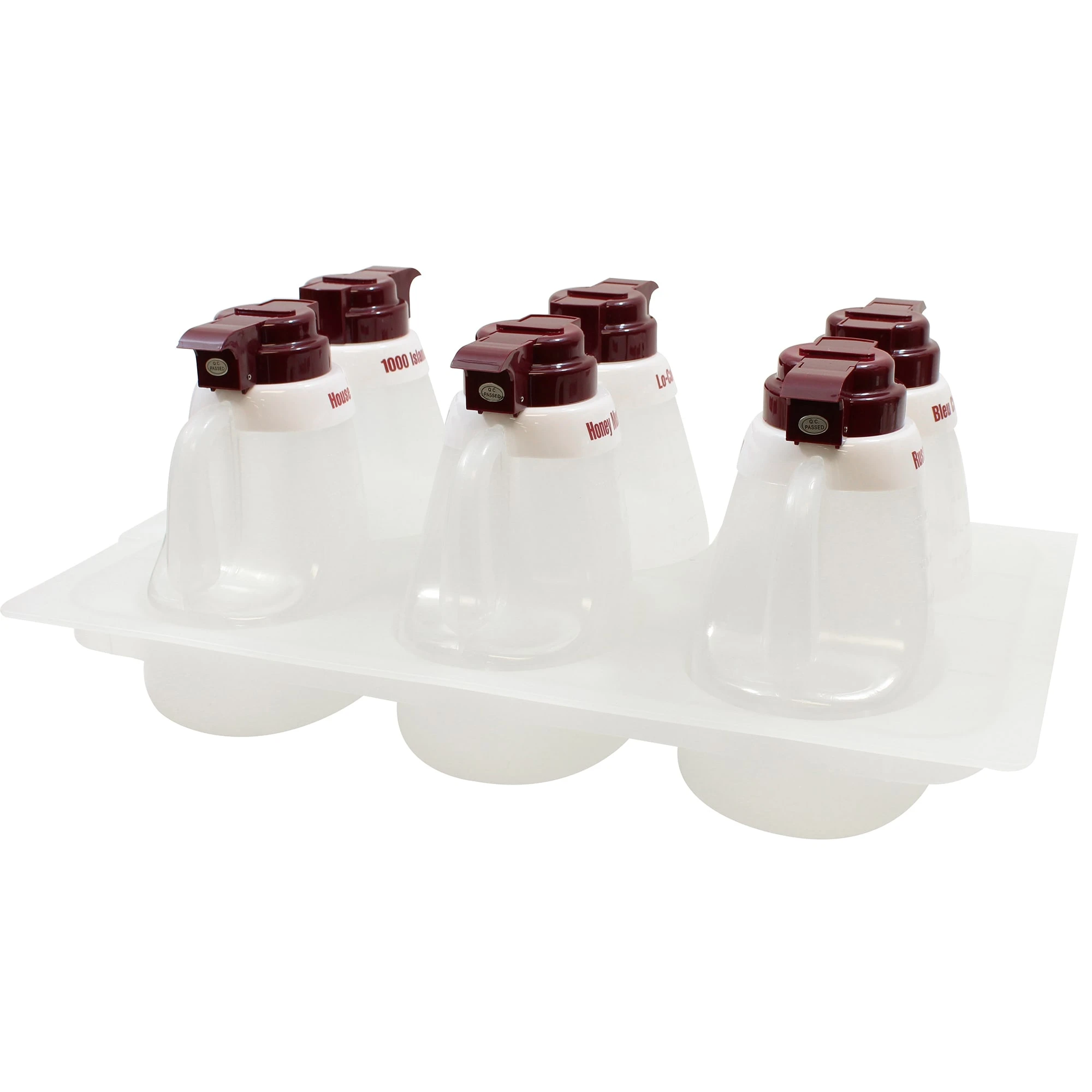 Serve salad dressings and sauces in TableCraft salad dressing dispensers. The set has an insert holder that measures 12″ L x 20″ W, and fits standard salad bar openings. Simply place the insert in your salad bar to offer your customers a variety of salad dressing options. There are six 48 ounce dispensers included that are made of translucent polycarbonate plastic. Six splash guards accompany the set, and are recommend for dressings that would require occasional shaking like Italian or vinaigrette. The dispenser are capped with maroon, ABS push button tops for fluid, easy pouring. Set also includes: (1) tray, (10) salad dressing flavors (Bleu cheese, French, House, Italian, Russian, 100 Island, and Vinagrette(.